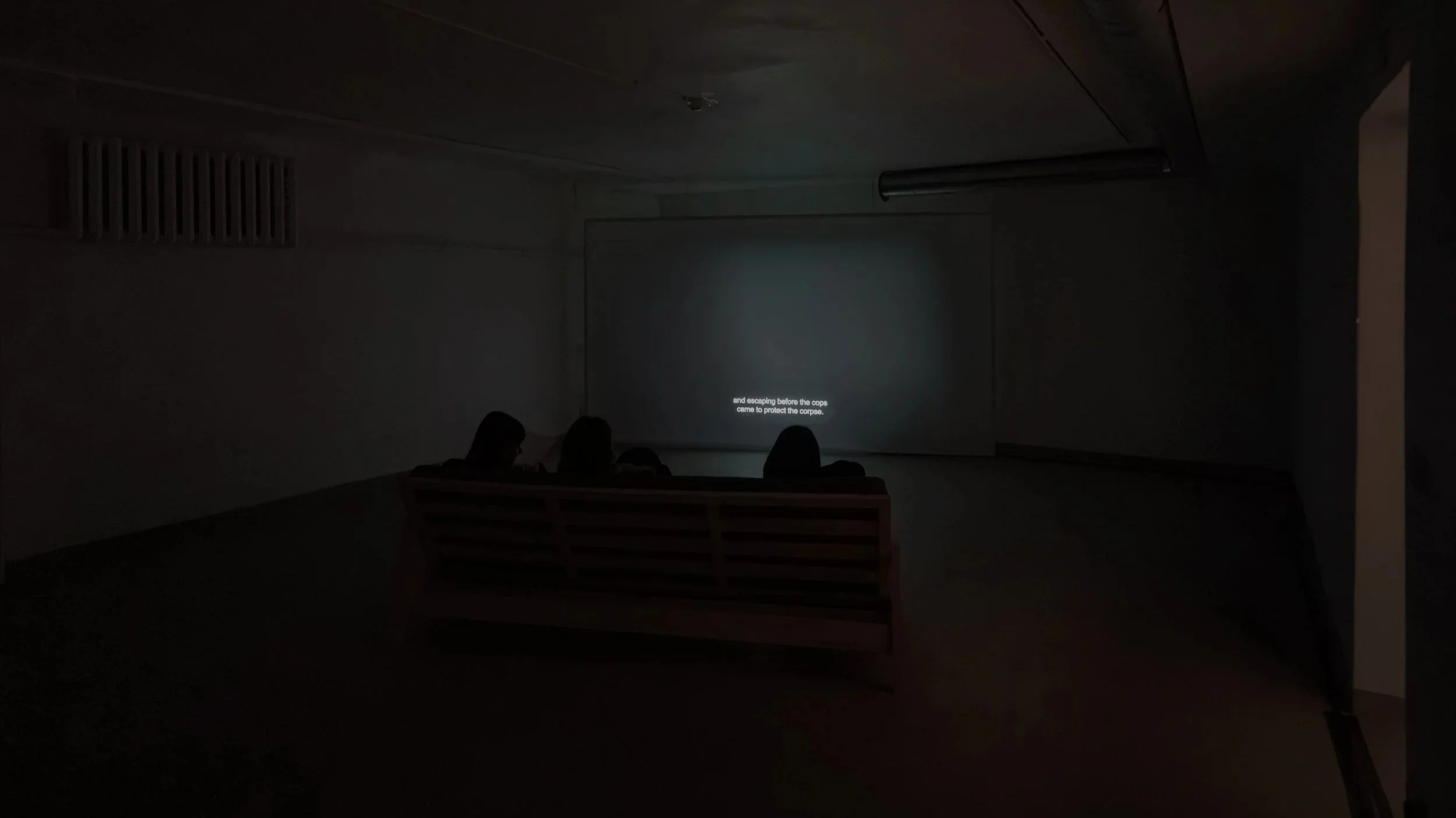 Video, sound, text. Seminar room, bullet points. Narrator, gestures, QR code. Distance from white guilt, malaise. Scales of death, datedness. Zoom out, in, out (as nobody is pure, the contradictions in striving toward an ethics of practice are insurmountable). Big drop. Scream.